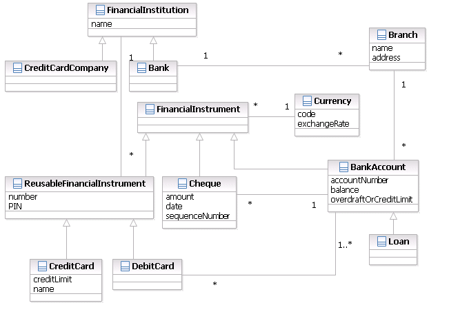 ![]() ![]() ![]() User Manual [Previous]  [Next] Banking System (b)Example/* Banking System - sample UML class diagram written in Umple Last updated: February 21, 2011 */ //Namespace for core of the system. namespace BankingSystem.core; class FinancialInstitution { name; 1 -- * ReusableFinancialInstrument; } class CreditCardCompany{ isA FinancialInstitution; } class Bank{ isA FinancialInstitution; 1 -- * Branch; } class FinancialInstrument{ } class ReusableFinancialInstrument{ isA FinancialInstrument; number; pin; * -> 1 Currency; } class CreditCard { isA ReusableFinancialInstrument; creditLimit; name; } class DebitCard { isA ReusableFinancialInstrument; } class Cheque { isA FinancialInstrument; amount; Date date; sequenceNumber; } class BankAccount{ isA FinancialInstrument; accountNumber; balance; Float overdraftOrCreditLimit; 1..* -- * DebitCard; 1 -- * Cheque; } class Currency { code; exchangeRate; } class Branch { name; address; 1 -- * BankAccount; } class Loan{ isA BankAccount; } Load the above code into UmpleOnline |