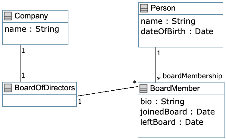 ![]() ![]() ![]() User Manual [Previous]  [Next] One-to-One AssociationsThe examples of associations in the previous user manual pages all showed cases where the lower-bound of the multiplicity at both ends is zero. For example there can be zero graduate students supervised by a professor, and zero professors might be assigned to supervise a graduate student initially. Allowing a lower bound of zero means that one object can be created without having to first create the object(s) it is to be linked to. The vast majority of associations have a lower bound of zero at at least one of the two ends. However there are a few situations where the lower bound at both ends of the association ought to be greater than zero. Here we will consider the one-to-one case. In the example below, a Company must always have one BoardOfDirectors and a BoardOfDirectors must always belong to one Company. But which should be created first? If we create the Company first, then a multiplicity constraint would be violated since for a period of time it would lack a Board. One solution would be to relax the constraint and decide that the association should not be 1-1. However Umple does allow 1-1 associations and creates a special API to allow both objects to be created at the same time. The generated code has a constructor with the arguments normally found in the constructors of both associated classes. So in the following main program, the call to the constructor of Company with just a single argument (company name) will construct both the Company and the BoardOfDirectors and link them (the BoardOfDirectors class normally takes no argument on its constructor). If the constructor of BoardOfDirectors had had any arguments they could have been provided to the constructor of Company. The constructor of Board of Directors also could have been used to create both objects simultaneously. It is worth noting that when a one-to-one association exists, there must always exist in the running system an equal number of both instances of both associated classes, and they must be linked in pairs. Another observation is that modellers tend to over-use one-to-one associations. A superior modeling solution might be to merge the two classes; in this case just have a Company class. ![]() An Executable Example Showing the Use of a One-to-One Association// Core class of the example // A company is a corporation class Company { name; // A company must have a BoardOfDirectors // that must be created at the same time // as the Company itself 1 -- 1 BoardOfDirectors; } // BoardOfDirectors is in a 1-1 relationship // with Company meaning that theoretically it // could just be merged into the Company class // However to facilitate separation of concerns // it is sometimes best to keep such classes // separate class BoardOfDirectors { // A BoardMember is just a member of one // board (but a person can be on multiple // boards using multiple BoardMembers) 1 -- * BoardMember; } // A board must have a set of members // Former board members tracked class BoardMember { bio; // Brief description of background lazy Date joinedBoard; lazy Date leftBoard; // One of the roles a person could play would // be as a Board member * boardMembership -- 1 Person; } // Generic Person class class Person { name; Date dateOfBirth; } // Mixin with a main program demonstrating // manipulation of 1--1 and other associations class Company { depend java.sql.Date; public static void main(String [] args) { // First create some instances of Person // They are initially not on any boards Person p1 = new Person("Alice", Date.valueOf("1990-01-01")); Person p2 = new Person("Bob", Date.valueOf("1991-02-02")); // Create a Company using the simpler of its // two constructors that doesn't require a // board to already exist. This will actually // create the BoardOfDirectors at the same time Company c = new Company("UmpleCorp"); BoardOfDirectors b = c.getBoardOfDirectors(); b.addBoardMember("Largest Shareholder", p1); b.addBoardMember("Founder", p2); // Output the results to prove that this works System.out.println("Key company info: "+c); System.out.println("Board members: "+ b.getBoardMembers()); } } Load the above code into UmpleOnline |