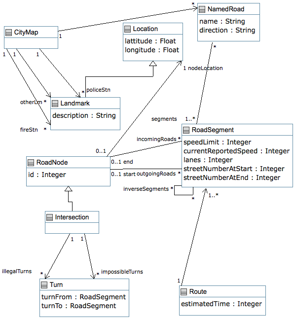 ![]() ![]() ![]() User Manual [Previous]  [Next] Routes And LocationsThis example has been built for the Comparing Modeling Approaches Workshop ![]() Example// RoutesAndLocations.ump Class diagram represented in Umple // // Author: Timothy C. Lethbridge namespace routesAndLocations; /* This file describes reusable model elements that are used in the bCMS Crisis Management System. It is necessary to have a rudimentary Graphical Information System such as described in this submodel as part of bCMS in order to plan routes and to track where crises are. This file has the necessary classes. */ /* * A CityMap contains the precompiled streets and landmarks * This must be read in from the database on system initialization */ class CityMap { singleton; 0..1 -> * Landmark fireStn; 0..1 -> * Landmark policeStn; 0..1 -> * Landmark otherLm; 0..1 -> * NamedRoad; } /* * A Location describes a place such as an intersection, landmark, bend in a road, etc. */ class Location { Float lattitude; Float longitude; } class Landmark { isA Location; // Name of landmark (name of fire station, business, address) description; landmarkType { fireStation { } policeStation { } touristDestination { } other { } } } /* * RoadNodes are places where RoadSegments connect. A node with just one incoming * and one outgoing is used to handle changes in direction, e.g. as a road turns * a corner, changes in speed limit, changes in number of lanes, and other factors. * When there is more than one outgoing or incoming, the node represents points * where traffic flow can split and join. * A crossroads is one type. Entry into a roundabout would be another, * Highway merges and exits are other kinds as are parking lots and entries * into or out of fire stations.. * * RoadSegments leaving the city lead to no RoadNode * RoadSegments entering the city come from no RoadNode */ class RoadNode { Integer id; // Could be at a landmark 0..1 -> 1 Location nodeLocation; 0..1 end -- * RoadSegment incomingRoads; 0..1 start -- * RoadSegment outgoingRoads; } class Intersection { isA RoadNode; // illegal, but possible turns for police and fire 0..1 -> * Turn illegalTurns; // Impossible turns , e.g. because of barriers, turning radius 0..1 -> * Turn impossibleTurns; } /* * Turns are used to model illegal turns, e.g. turning left * when there is 'no left turn' allowed, or 'no U turn' allowed. */ class Turn { RoadSegment turnFrom; RoadSegment turnTo; } /* * A named road might have the name of a street, the number of * a highway, etc. A RoadSegment can have several names because * for example, sometimes several numbered highways share a segment */ class NamedRoad { name; // Most roads have two directions, e.g. North and South direction; // Listed in order * -- 1..* RoadSegment segments; } /* * A RoadSegment represents a section of road on which a vehicle can drive. * The ends of each segment have been modeled using RoadNodes. * Note that distance can be calculated from the speed limit, and locations */ class RoadSegment { Integer speedLimit; // Indicator of real-time congestion; 0=blocked Integer currentReportedSpeed; Integer lanes; // The following are used to determine addresses Integer streetNumberAtStart; Integer streetNumberAtEnd; * -> * RoadSegment inverseSegments; } /* * A route is a plan to get from one location to another * It is built by algorithms that traverse the nodes and arcs of the map * taking into account speed, congestion, etc. */ class Route { // Ordered list of segments 0..1 -> 1..* RoadSegment; // Time seconds at current flow speeds Integer estimatedTime; } Load the above code into UmpleOnline |