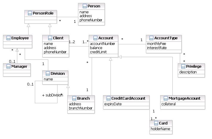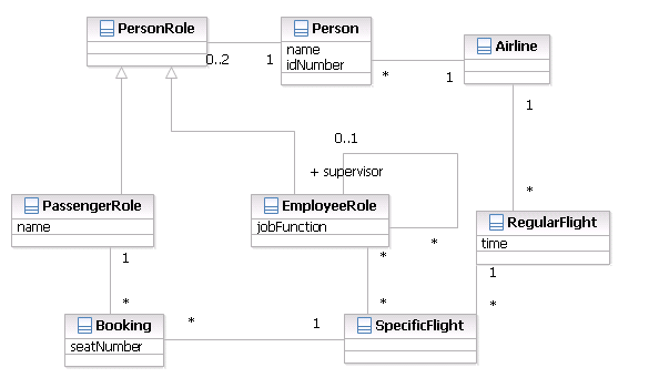 interface RegisterCapable { depend school.util.*; boolean registerForCourse(Course aCourse); } class Person { name; } class CorporateClient { isA RegisterCapable; boolean registerForCourse(Course aCourse) { // write code here } 0..1 <- * Person employees; } class IndividualStudent { isA Person, RegisterCapable; boolean registerForCourse(Course aCourse) { // write code here } } class Course { name; description; * -- * Person registrants; }