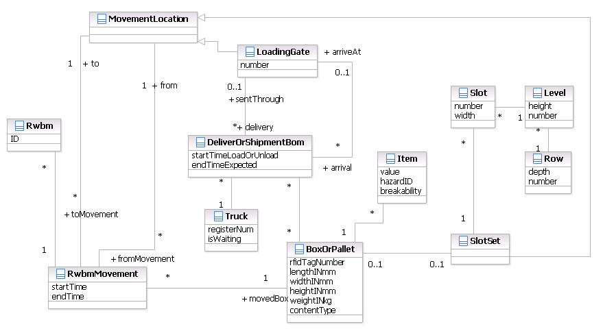 ![]() ![]() ![]() User Manual [Previous]  [Next] Warehouse SystemExample// UML class diagram of a system for managing a warehouse namespace warehouse; class MovementLocation{} class SlotSet{ isA MovementLocation; 0..1 -- 0..1 BoxOrPallet; 1 -- * Slot; } class Slot{ Integer number; Double width; } class Level{ Integer height; Integer number; 1 -- * Slot; } class LoadingGate{ Integer number; isA MovementLocation; } class Truck{ Integer registerNum; Boolean isWaiting; 1 -- * DeliverOrShipmentBom; } class Rwbm{ Integer id; } class Item{ Double value; Integer hazardID; Integer breakability; } class Row{ Integer depth; Integer number; 1 -- * Level; } //Note that here we have the choice to use // Time or Double, if the customer requires Double due to // some interoperability issues with a legacy syste, we can easily // accomodate them and use Double instead of Time. class RwbmMovement{ Double startTime; Double endTime; * toMovement -- 1 MovementLocation to; * fromMovement -- 1 MovementLocation from; * -- 1 BoxOrPallet movedBox; 1 -- * Rwbm; } // Both associations should be -> class DeliverOrShipmentBom { Double startTimeLoadOrUnload; Double endTimeExpected; * delivery -- 0..1 LoadingGate sentThrough; * arrival -- 0..1 LoadingGate arriveAt; } class BoxOrPallet{ Integer rfidTagNumber; Double lengthINmm; Double widthINmm; Double heightINmm; Double weightINkg; String contentType; * -- * DeliverOrShipmentBom; 1 -- * Item; } Load the above code into UmpleOnline |